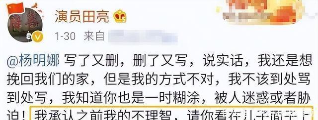 突然被老公网上开撕,这一招真够狠的 2019年,事情彻底爆发了。 田亮在社交平台上发了好几条动态,把杨明娜往死里黑。 他说杨明娜婚后根本不管孩子,天天忙着接戏,把孩子扔给保姆。