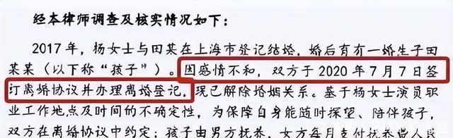 协议离婚孩子给了他,谁知道这只是开始 2020年,两人终于协议离婚了。 离婚协议里,孩子的抚养权归田亮。 杨明娜当时已经被搞得心力交瘁,她想着既然田亮那么想要孩子,就给他吧,自己也能专心处理事业上的烂摊子。