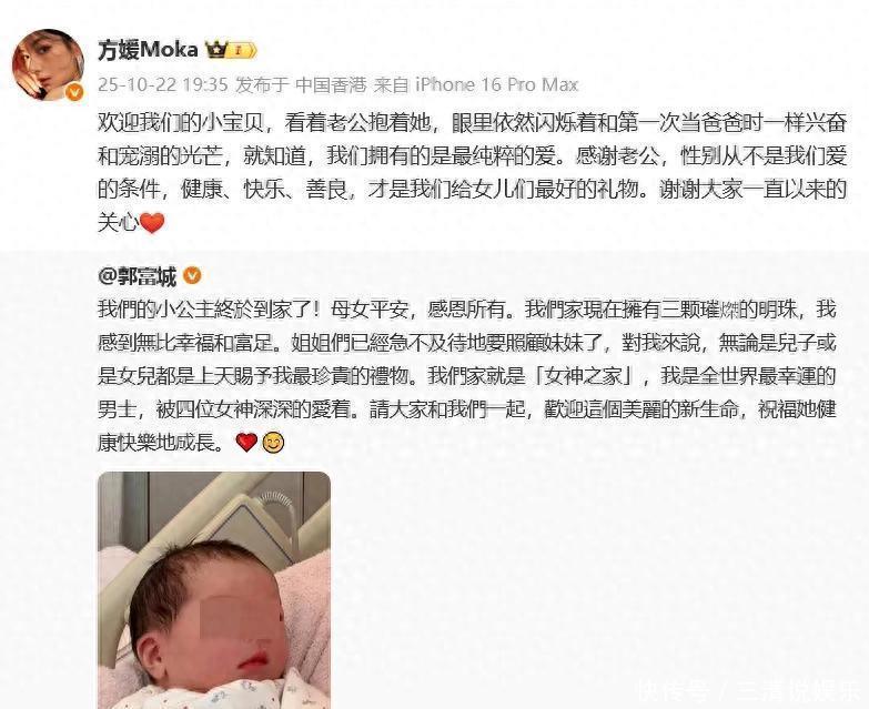 娱乐圈又传喜讯!10月22日,59岁的“天王”郭富城和38岁的妻子方媛正式官宣三胎女儿平安出生。郭富城激动发文:“我们的小公主终于到家了!母女平安,感恩所有。”他还幸福地宣布,自家现在是“女神之家”,自己作为“全世界最幸运的男士,被四位女神深深爱着”。方媛随即转发老公动态,甜蜜回应:“看着老公抱着她,眼里依然闪烁着和第一次当爸爸时一样兴奋和宠溺的光芒,就知道,我们拥有的是最纯粹的爱。”她更是掷地有声地强调:“性别从不是我们爱的条件,健康、快乐、善良,才是我们给女儿们最好的礼物。” 这番温情告白瞬间冲上热搜,也让此前港媒关于“追生男宝”的炒作不攻自破。