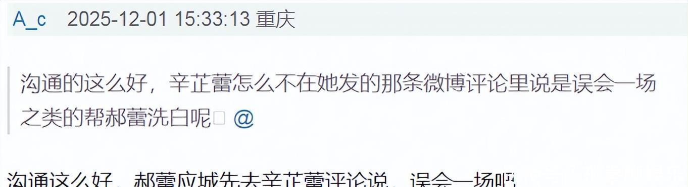 其次,如果当天郝蕾就已经和辛芷蕾友好的沟通好了,在辛芷蕾发澄清文的时候,郝蕾应该在其评论区帮其澄清,留言“一场误会”之类的。然而无任何互动。