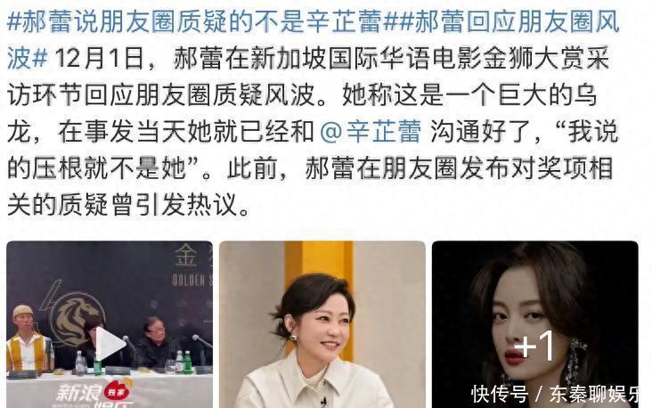 11月7日时,郝蕾在朋友发小作文疑嘲讽辛芷蕾靠“扯头发”、团队运作获得威尼斯奖,引发争议。之后,辛芷蕾也发文强硬回应。此事在网上闹得沸沸扬扬的。而就在12月1日,郝蕾在参加新加坡国际电影金狮奖采访环节,再次被问及此事。她首次回应了这场风波。