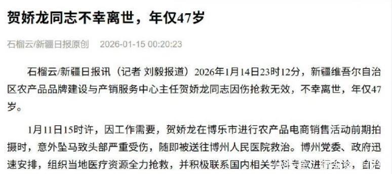 她的离去消息其实一早就让人心慌,1月13号网上开始流传贺娇龙突发意外,大家都在求证真假。官方很快出来回应,说人在医院抢救,总之那个时候还是给出了希望。结果也不过一天,事情彻底坐实,贺娇龙真的走了,年仅47岁,这件事在新疆当地和网络上,真的炸锅了。聊到她的具体经历,有网友还在去年提醒过贺娇龙,让她拍摄骑马的时候一定要注意安全,雪地里马蹄子容易陷进去出事。提醒其实很及时,但看着她视频里的酷炫骑马动作,真的有点让人捏把汗。她还在2025年最后一天发了一段自己47岁的生活总结,很多人后来才觉得那个视频像是在做告别。